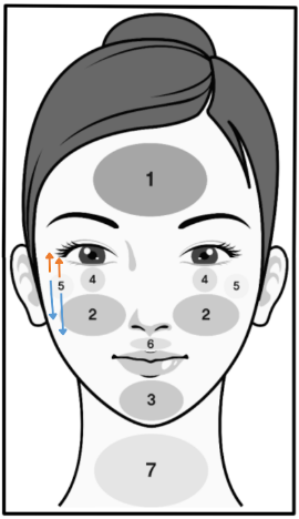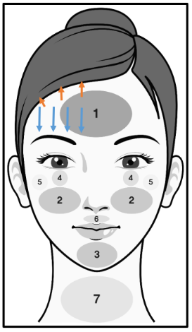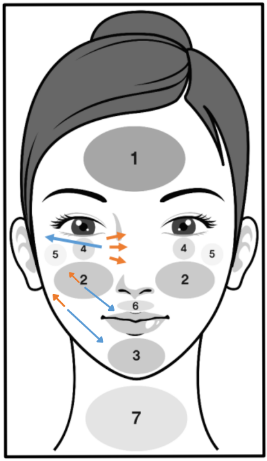 Using the diagram below, start with the neck area. Create tension with your fingers, following the orange arrows and moving your device with the blue arrows. When approaching curved areas such as the forehead, use shorter strokes to avoid increasing pressure on the skin.