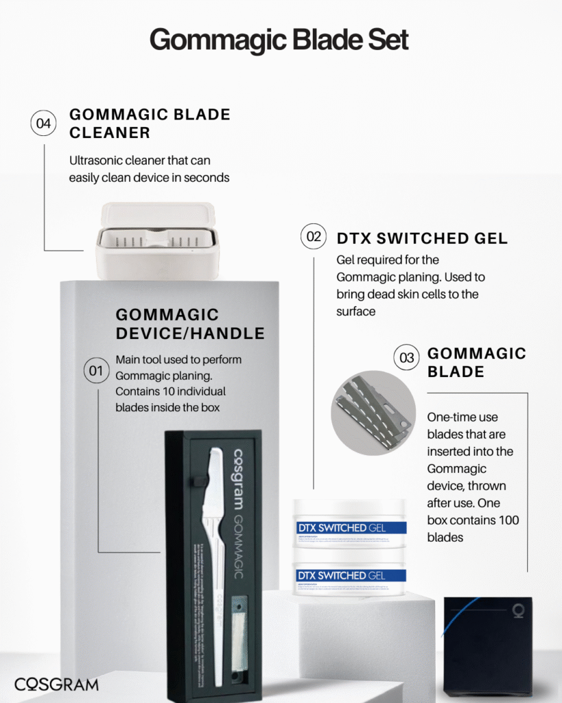Uses the Gommagic Blade and a special gel (DTX Switched Gel) to soften, lift, and remove dead skin cells without cutting or over-peeling.