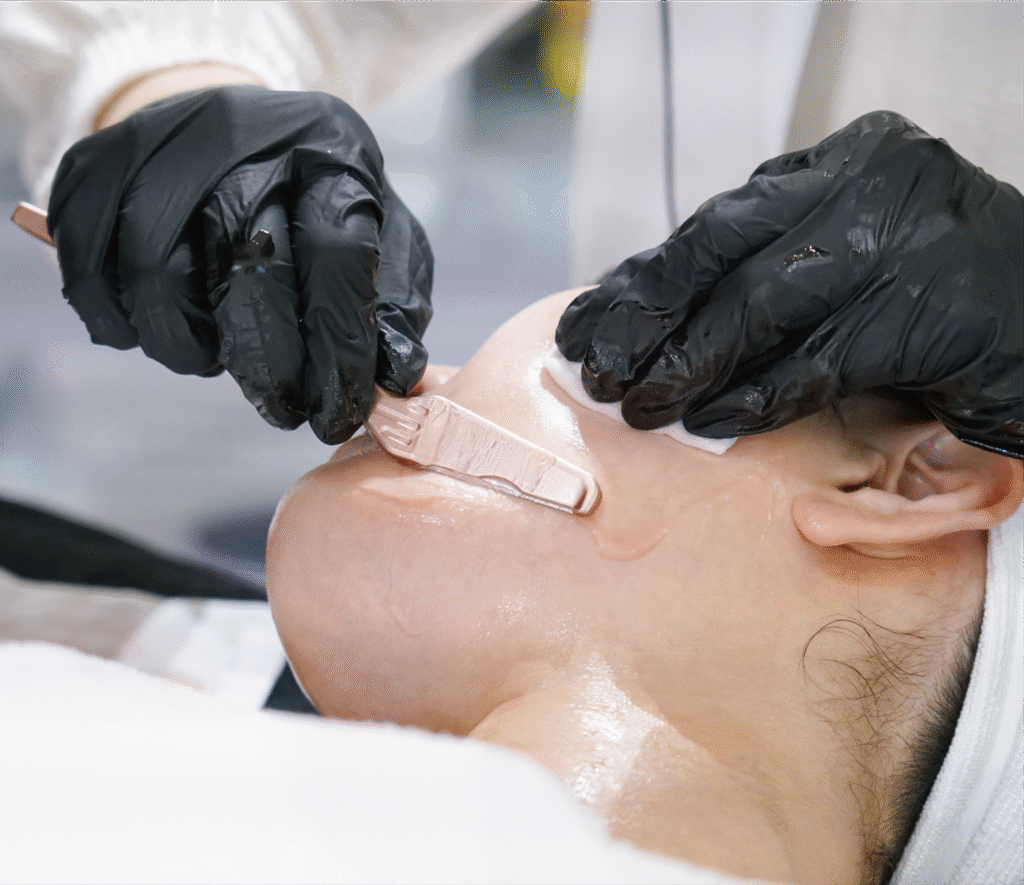 Uses a sterile, surgical blade to gently skim the surface of the skin, removing dead skin cells and fine hair.